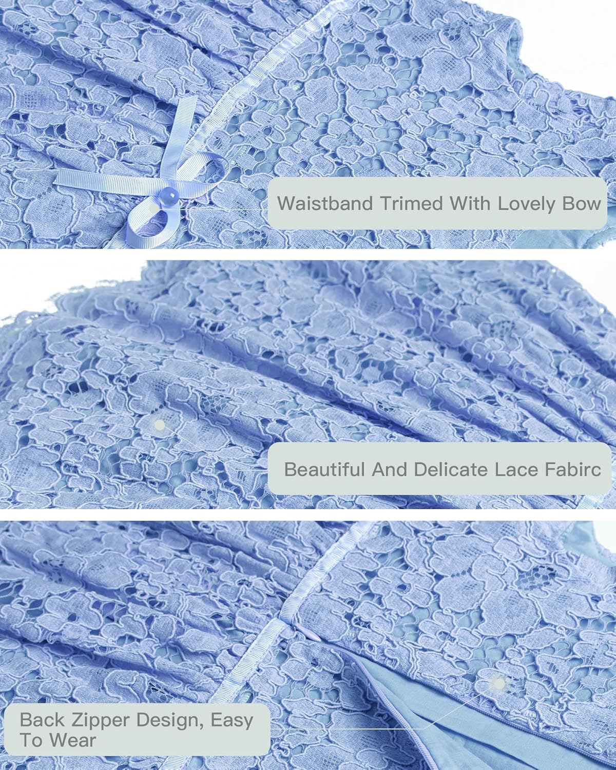 A-line fit; floral lace; a bowknot decor at the waist; knee length; hidden back zipper closure.