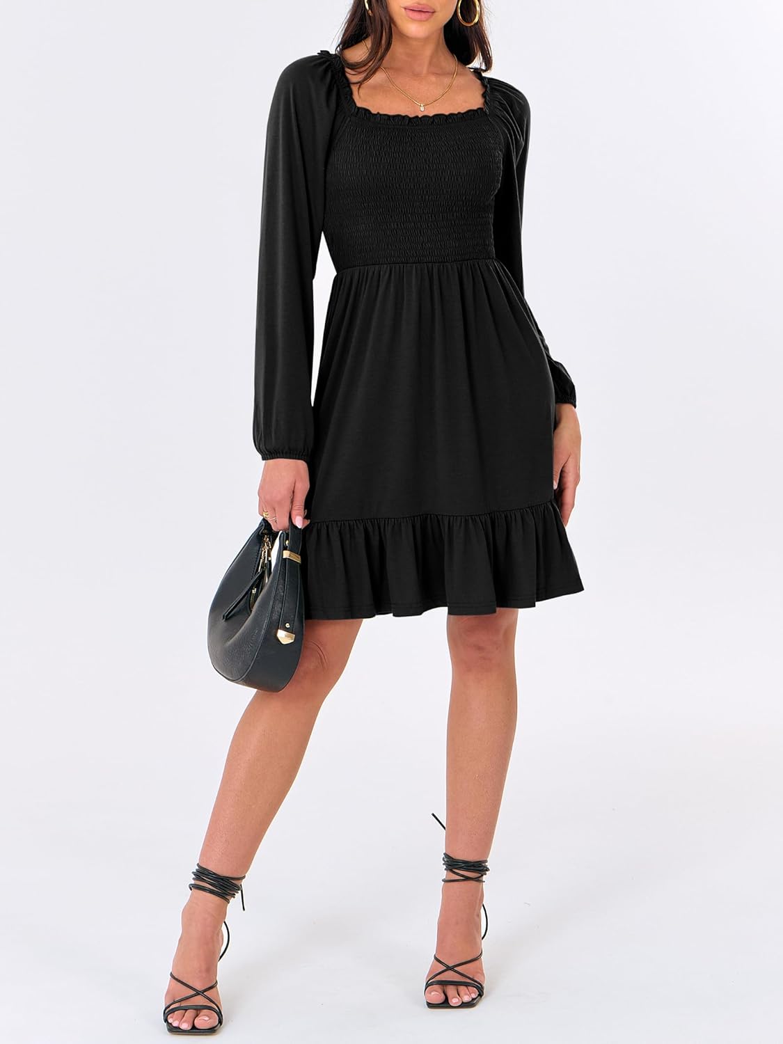 ANRABESS Womens Long Lantern Sleeve Square Neck Dress Smocked Tiered High Waist Ruffle Flowy Swing 2026 Spring Short Dresses