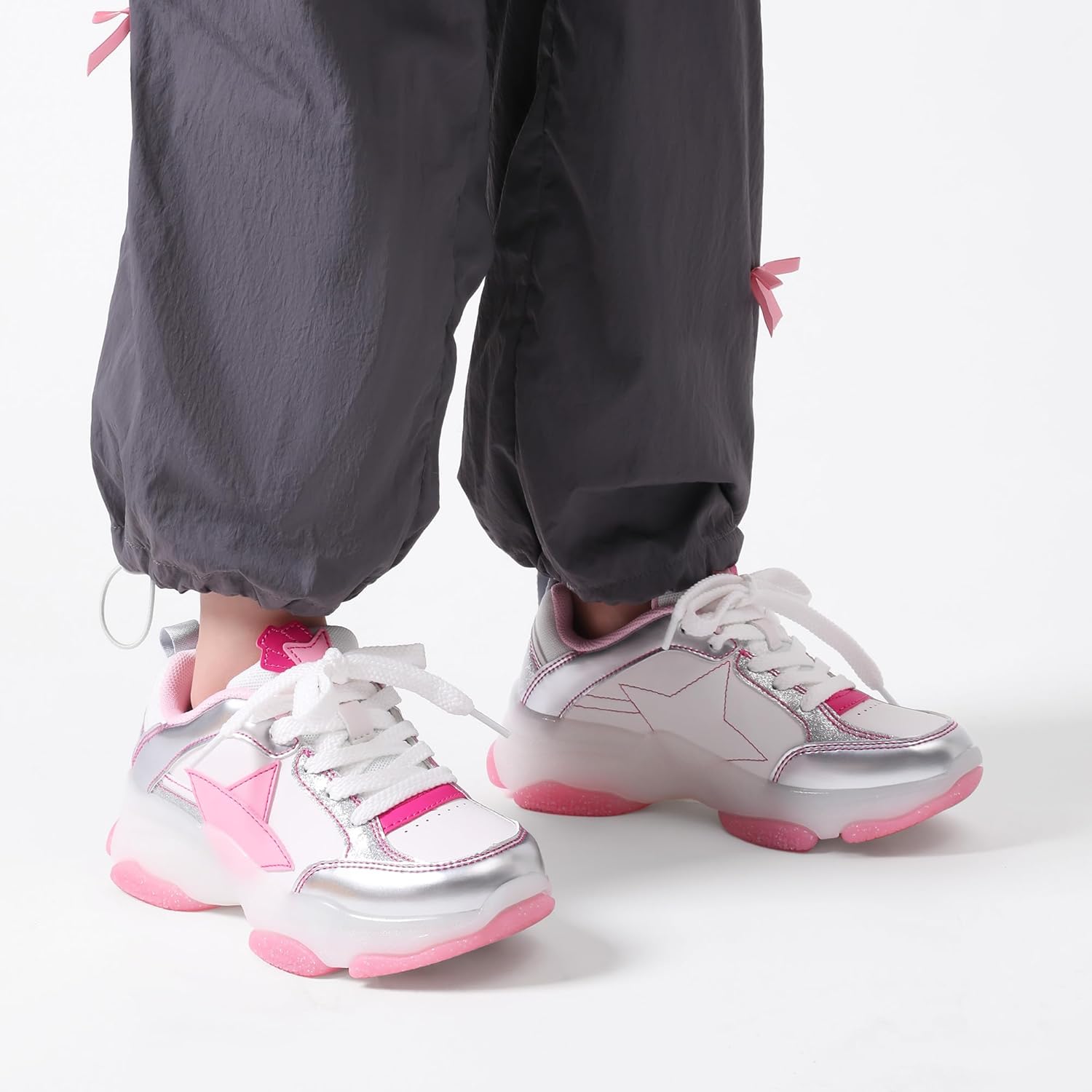 DREAM PAIRS Girls Sneakers Lace up Lightweight Sparkle StarGlow Breathable Jelly Sole Kids Walking Shoes Casual Sports