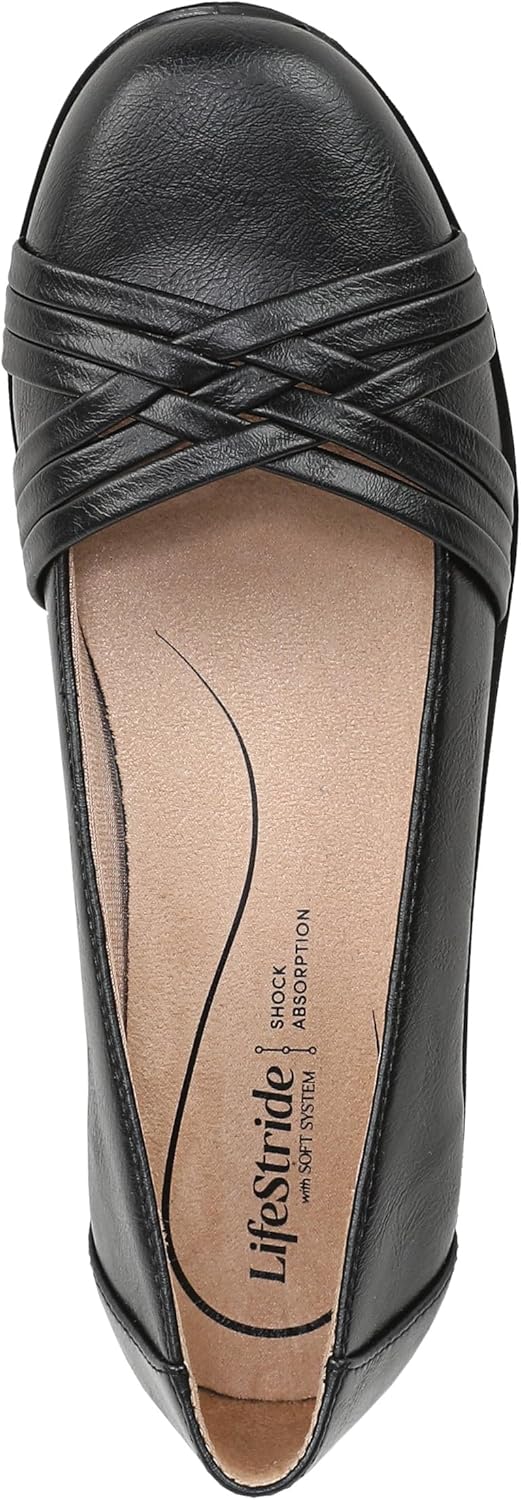 Go everywhere life takes you this season in a stylish flat with cute crisscross straps over a rounded toe. Faux leather with a round toe, slip-on fit, lightweight and flexible design, and overlapping strap design. Toe box, heel counter, and linings partially crafted with recycled materials. Soft System® comfort package provides all-day support, flex, and cushioning. Get next-level comfort with Velocity 2.0®, featuring luxe linings, superior cushioning, and a premium insole with shock absorption & pressure distribution. Traction sole provides you with extra stability. Just Right Height 1.75 inch wedge heel.