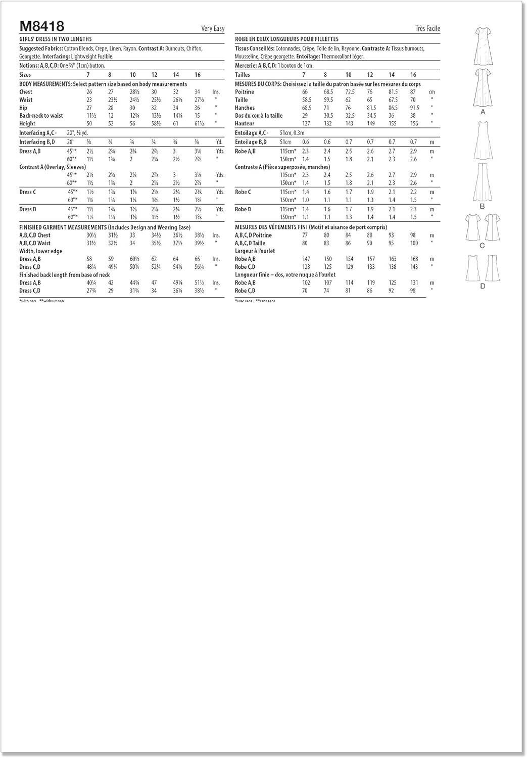 From chic pieces for special occasions to comfy and versatile daily pieces, McCall’s patterns offer something for every wardrobe or clothing collection – our line even includes patterns for home essentials and play! Sleeveless or short sleeved dress has rounded neckline and back keyhole with loop and button closure. Dress A has a sheer overlay. . Sewing pattern packet comes with sewing templates, fabric recommendations, pattern pieces, sizing guides, and instructions. Can be made to fit girl’s sizes 7-8-10-12-14-16. Proudly manufactured in the United States of America.
